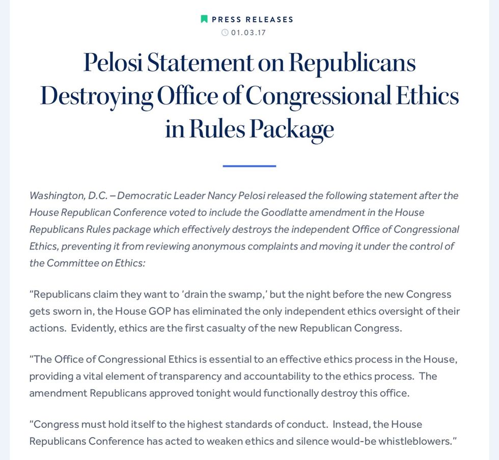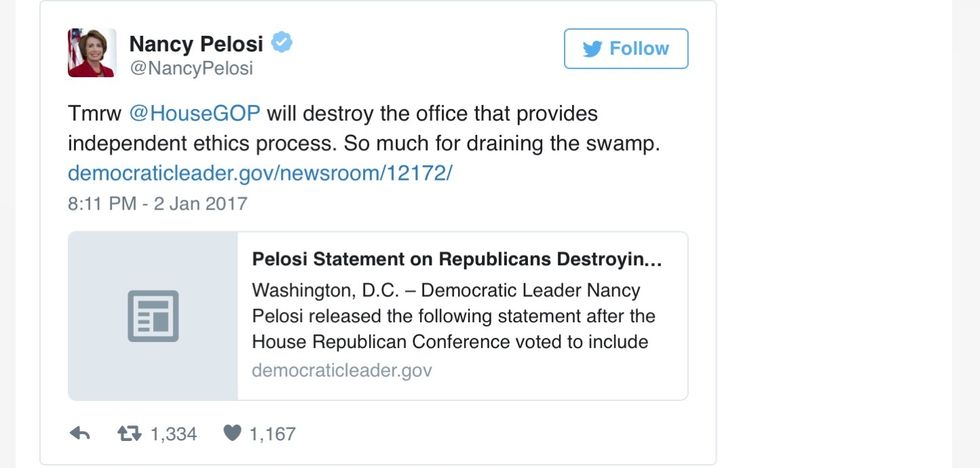 "Republicans claim they want to 'drain the swamp,' but the night before the new Congress gets sworn in, the House GOP has eliminated the only independent ethics oversight of their actions," Democratic Leader Pelosi said in a statement. "Evidently, ethics are the first casualty of the new Republican Congress."