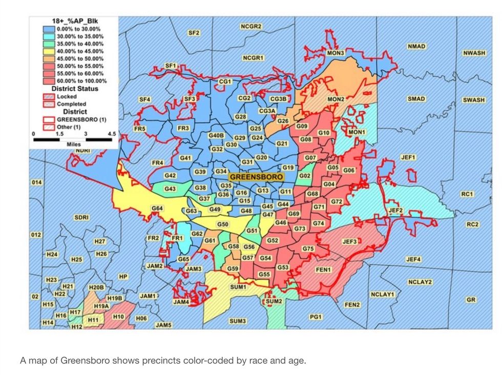 His hard drive contained maps of Greensboro with the titles "Greensboro Master Race," "Greensboro - Pct Blk - City Only vap," "Greensboro 45+ BVAP Compactness" and "Greensboro 50+ bvap Compactness." (vap is short for "voting-age population," and bvap is an abbreviation for "black voting-age population.") The "Greensboro Master Race" file contains a color-coded map that shows the city's black population, age eighteen and older, by precinct.