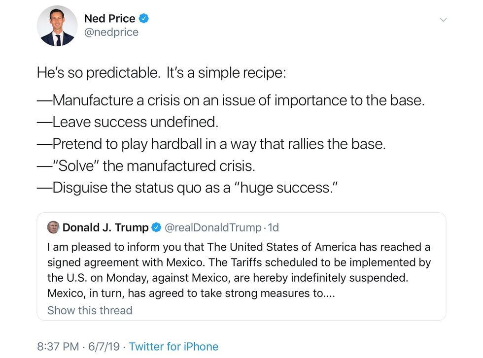 You may want to remember this analysis by Ned Price, the next time Trump manufactures a crisis. Always remember too that the “deal” he proclaimed as his victory against Mexico occurred in December 2018 while the Trump threat of accelerating tariffs against Mexico occurred in June 2019.