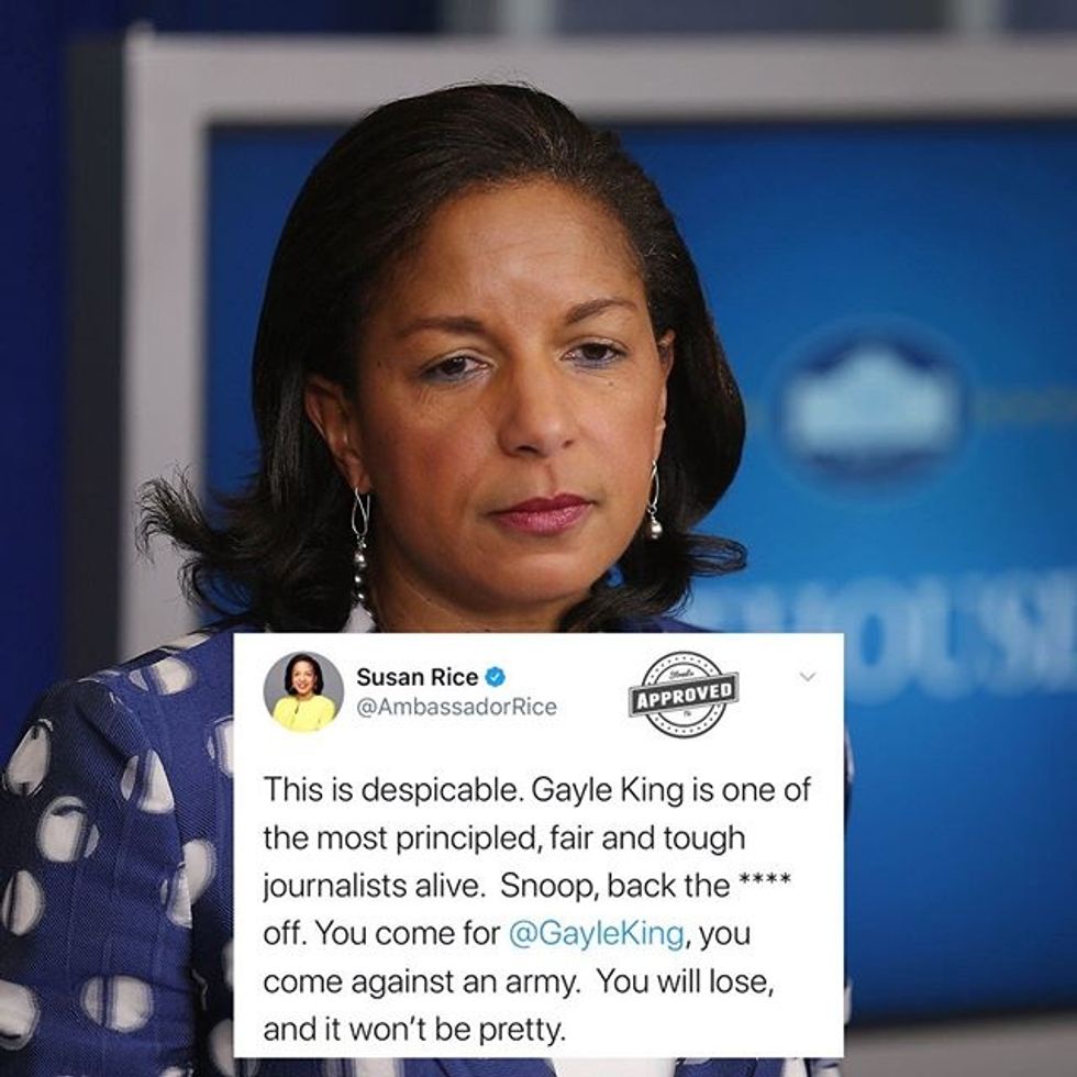 Voices4America Post Script. In a world where bullying and threats are the norm established by the White House, this happened. Make clear where you stand. Susan Rice-"You come against Gayle King, you come against an army." #ImWithGayle
