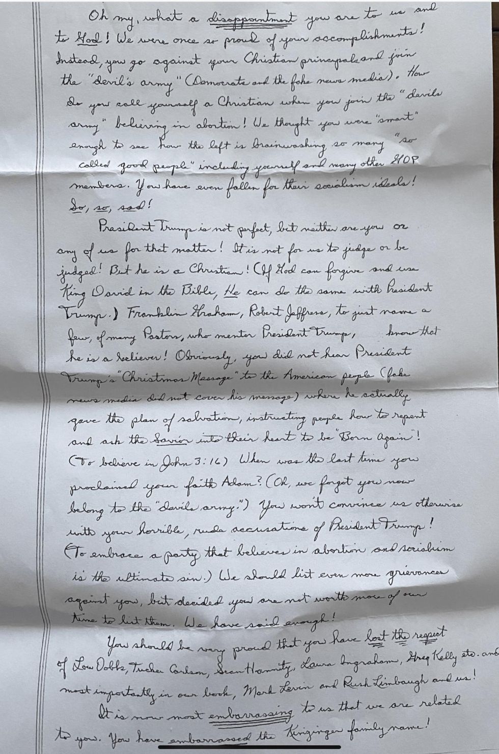 Two days after Mr. Kinzinger called for removing Mr. Trump from office following the Jan. 6 riot at the Capitol, 11 members of his family sent him a handwritten two-page letter, saying he was in cahoots with "the devil's army" for making a public break with the president.