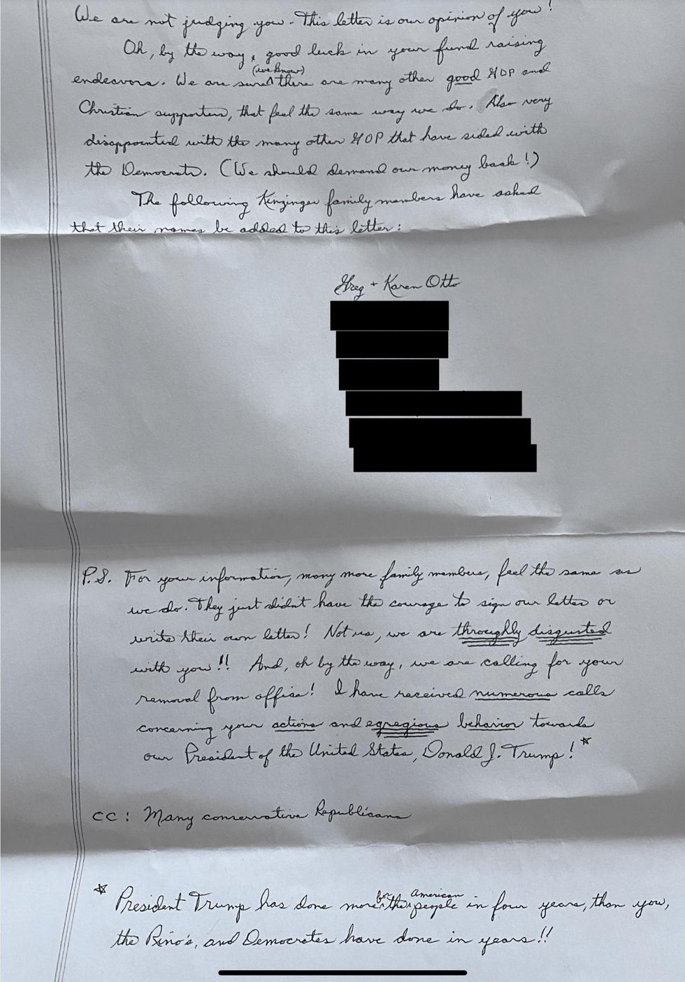 A hand-written letter from several members of Rep. Adam Kinzinger's family. The Times has redacted the names of some family members who signed the letter but whom we did not interview.