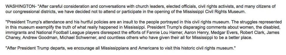 Civil rights legend @RepJohnLewis declines to attend the opening of the Mississippi Civil Rights Museum due to Trump's presence, calling it "an insult to the people portrayed in this civil rights museum."