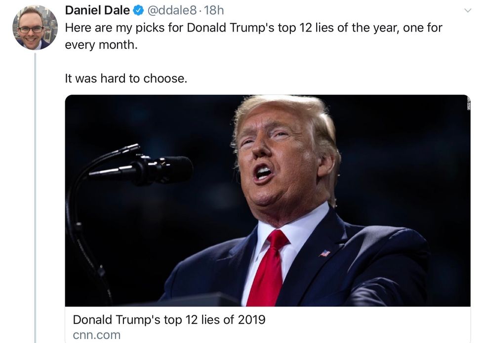 Trump made more than 2,700 false claims this year. (We're still calculating the final total.) Some of them were innocent slips, some of them little exaggerations. But a large number of them were whoppers: deliberate, significant attempts to deceive and manipulate.The breadth of the dishonesty was as striking as the frequency. Trump was inaccurate this year about every conceivable topic, from his dealings with Ukraine to the size of his crowds to, literally, the time of day. He told too many lies for us to confidently pick a single most notable lie of the year. So we've picked our 12 most notable, one for every month. (We're defining notable as some combination of egregious, important and bizarre.)