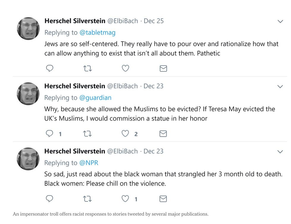 You probably haven't heard of these trolls, but that is precisely why they are so pernicious. These bigots are not content to harass Jews and other minorities on Twitter; they seek to assume their identities and then defame them