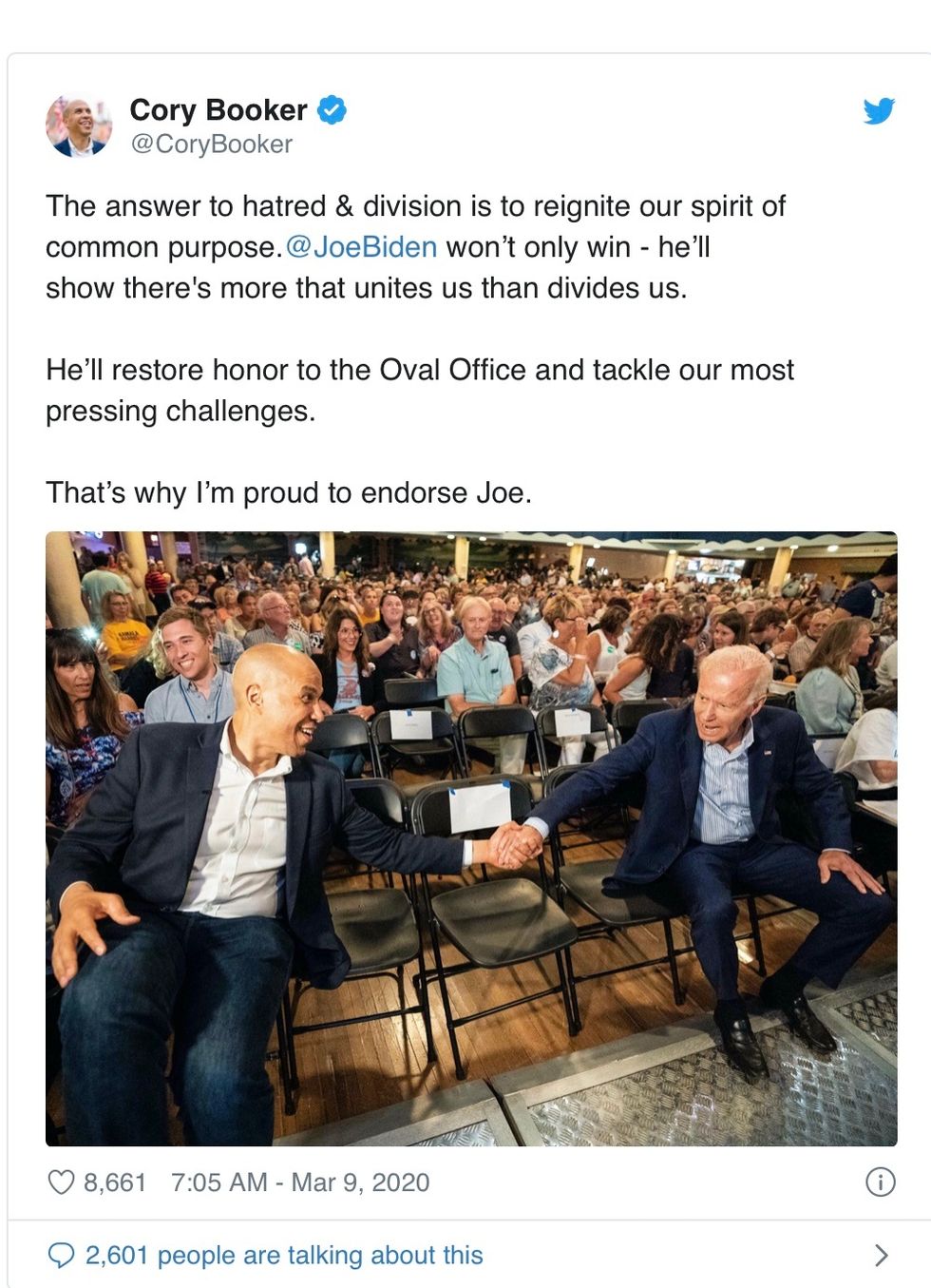 Mr. Booker, despite dropping out before the nation's first primary contest, had previously campaigned in Detroit this cycle in an effort to pitch himself as the best candidate to re-energize the fractured Obama coalition and restore the black vote in swing states that Hillary Clinton lost in 2016.Though Mr. Biden has indicated that he would most likely select a woman as a running mate, Mr. Booker's support for Mr. Biden as the race effectively narrows to two candidates will inevitably draw some speculation as to the New Jersey senator's future.