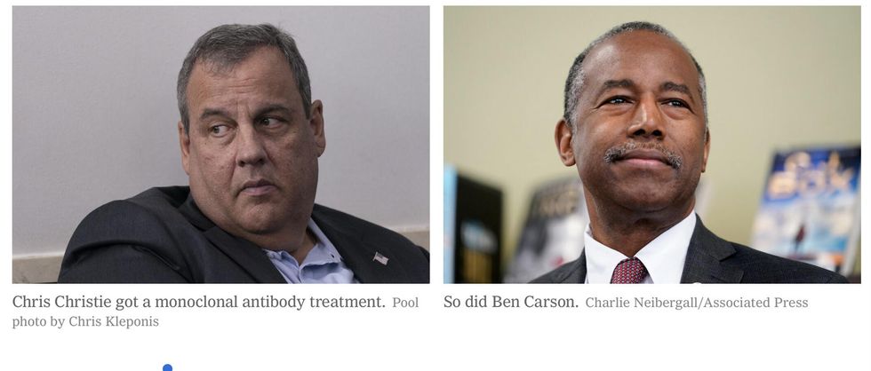 In October, Chris Christie, the former New Jersey governor and an informal adviser to the president, got a different monoclonal antibody treatment, one produced by Eli Lilly. Housing Secretary Ben Carson wrote on Facebook that Trump "cleared" him to receive monoclonal antibody therapy when he was hospitalized with Covid-19 last month.
