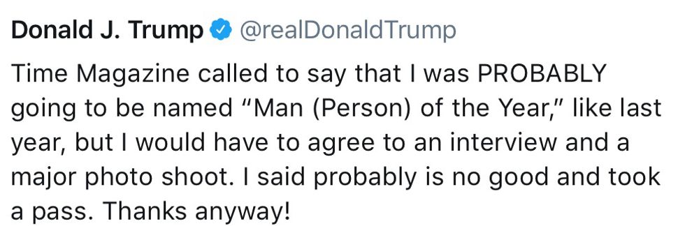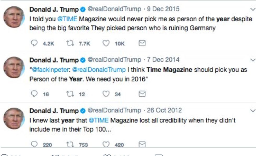 It is clear that the stresss Trump feels from the momentous matter of whether or not he will be Man(Person) of the Year has once again pushed him off the ledge.