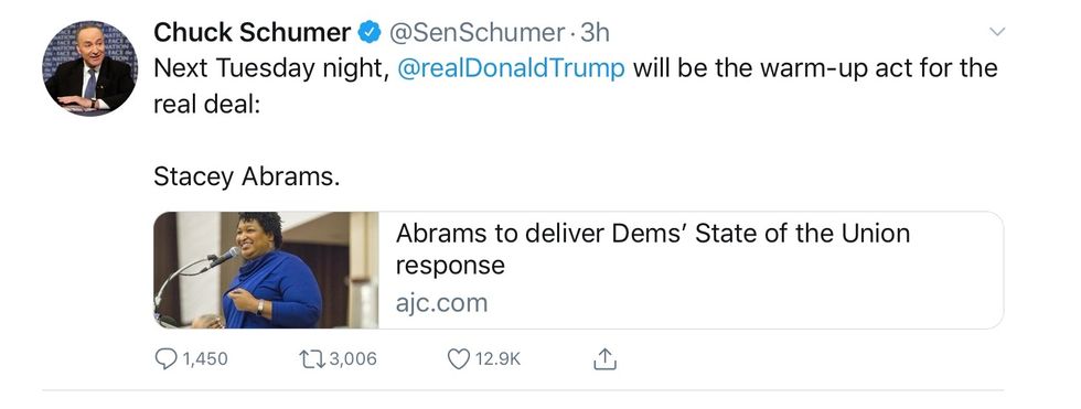 Senate Minority Leader Chuck Schumer, D-N.Y., announced the selection of Abrams on Tuesday, saying he extended the offer to her about three weeks ago and was excited she had accepted to give the rebuttal on Feb. 5.