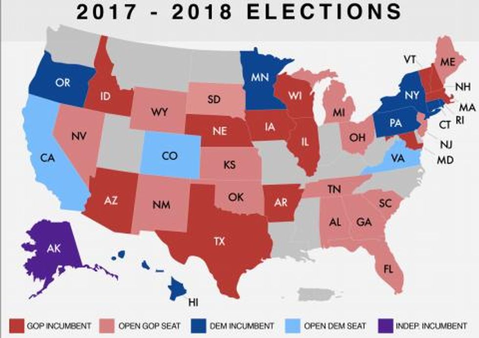 But the other part of the story is that, in 2017 and 2018, there will be a total of 38 gubernatorial contests. Here, courtesy of the Democratic Governors Association, is the 2017-2018 gubernatorial map: