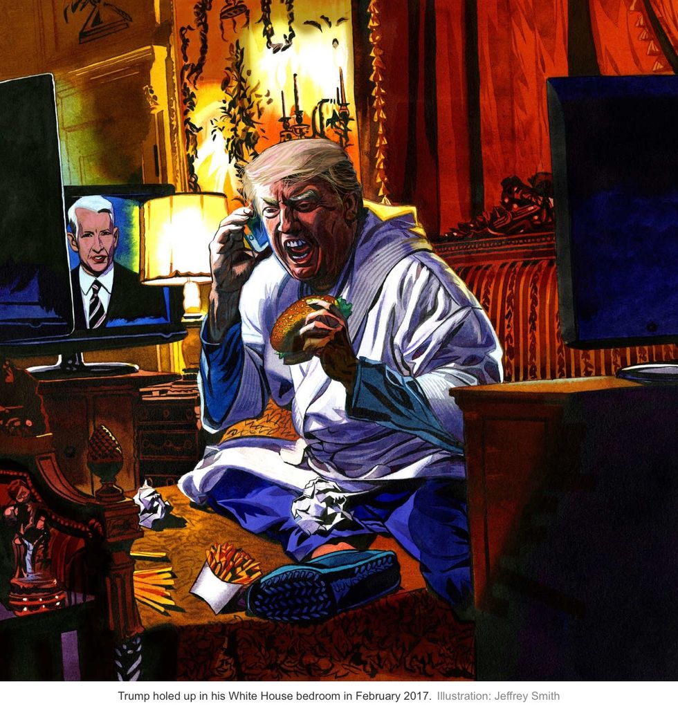 If he was not having his 6:30 dinner with Steve Bannon, then, more to his liking, he was in bed by that time with a cheeseburger, watching his three screens and making phone calls — the phone was his true contact point with the world — to a small group of friends, who charted his rising and falling levels of agitation through the evening and then compared notes with one another.