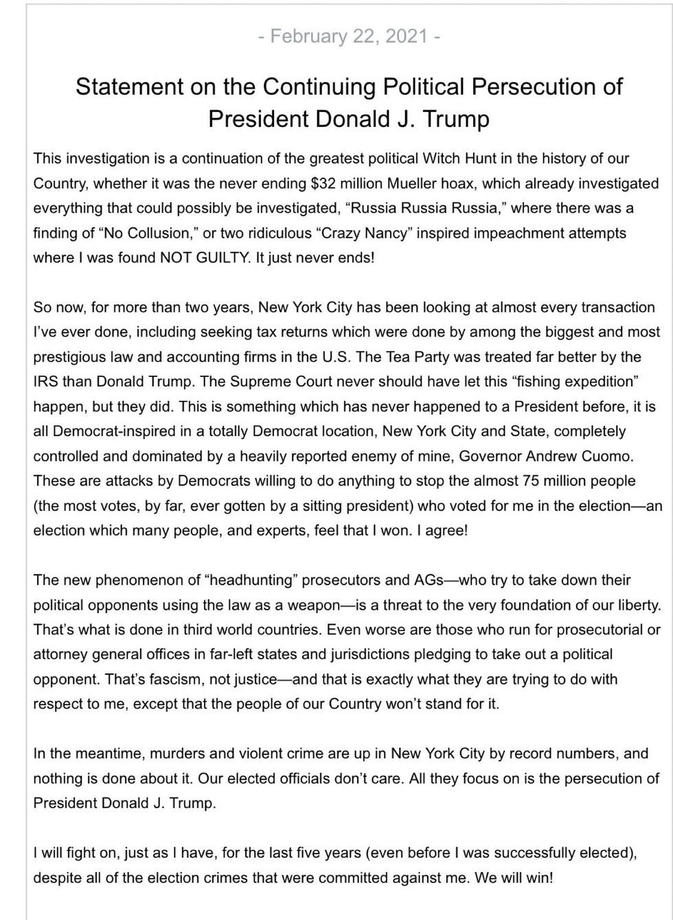 Trump's response bears every hallmark of an authentically Trump-authored text, as opposed to the knockoff versions produced by his aides. It is meandering, filled with run-on sentences, gratuitous insults, and exclamation points. Trump's position on the tax returns rests on a series of assertions, ranging from his false claim that Robert Mueller found "No Collusion" to his insistence that he actually won the 2020 election to his extremely ironic complaint that prosecutors targeting their political opponents is "fascism, not justice." (Trump, of course, spent his presidency publicly demanding his Attorneys General investigate his political rivals.)