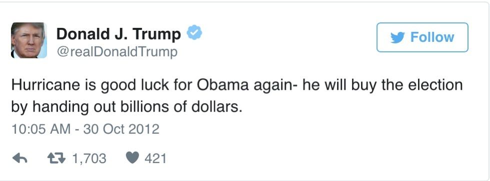 It's no secret that Donald Trump has been trolling President Obama for years. Trump magnified the birther conspiracy against the first black president, so it should come as no surprise that in 2012 after Hurricane Sandy devastated regions of our country and killed at least 147 people, Donald Trump was more focused on trolling Obama.