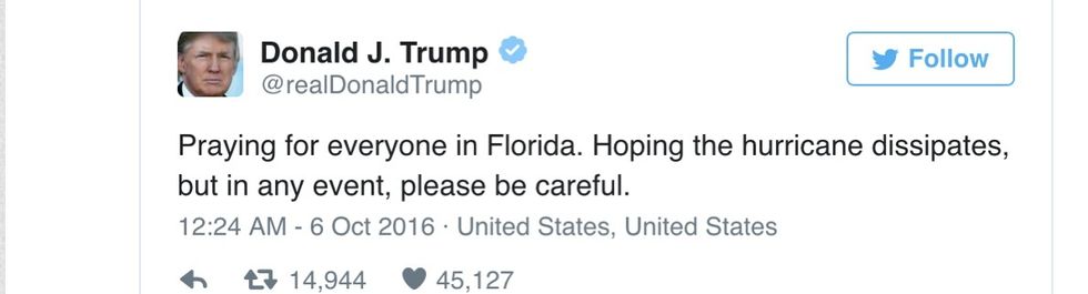 Perhaps we should count ourselves lucky that instead of exploiting Hurricane Matthew to his advantage, Donald Trump managed to send a generically worded civilized tweet about the storm: