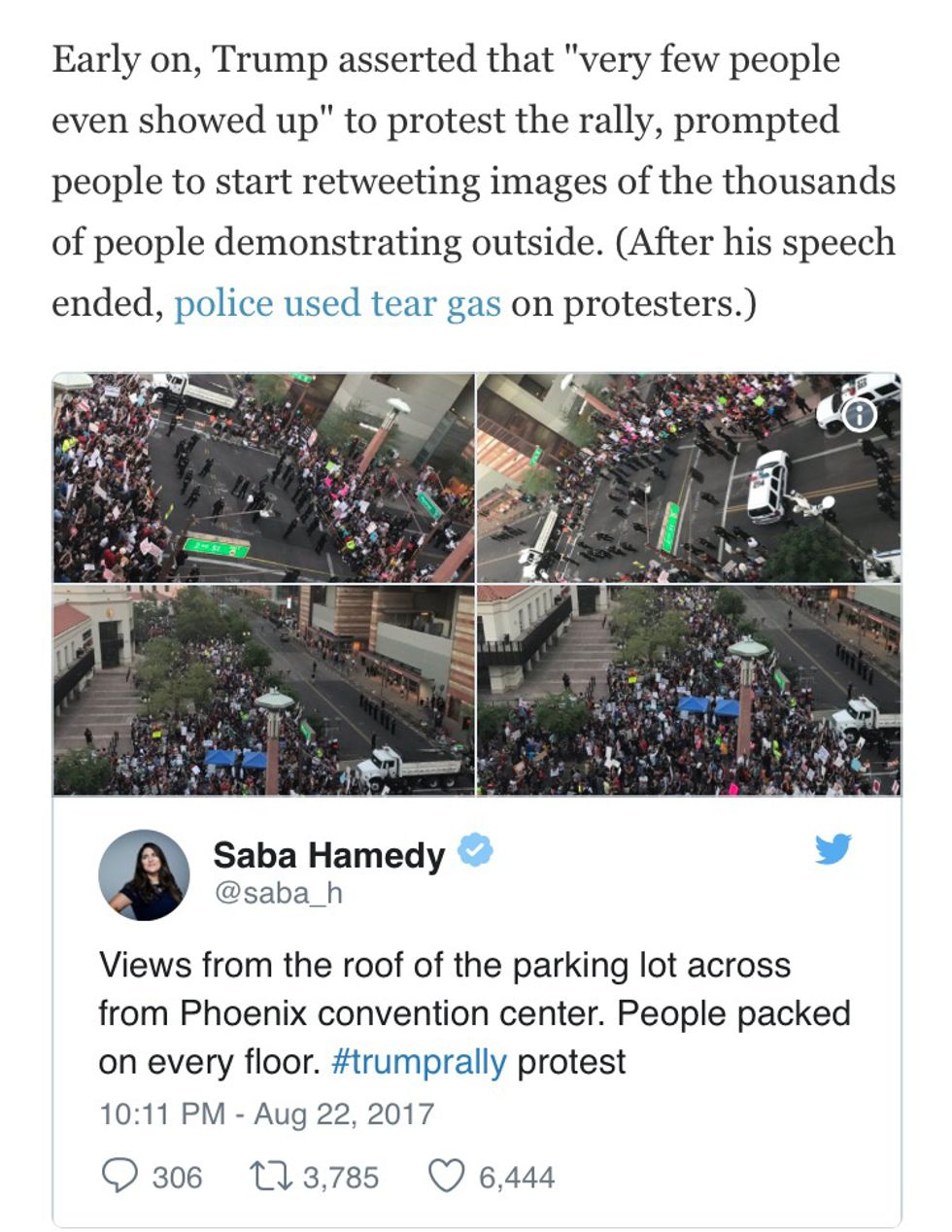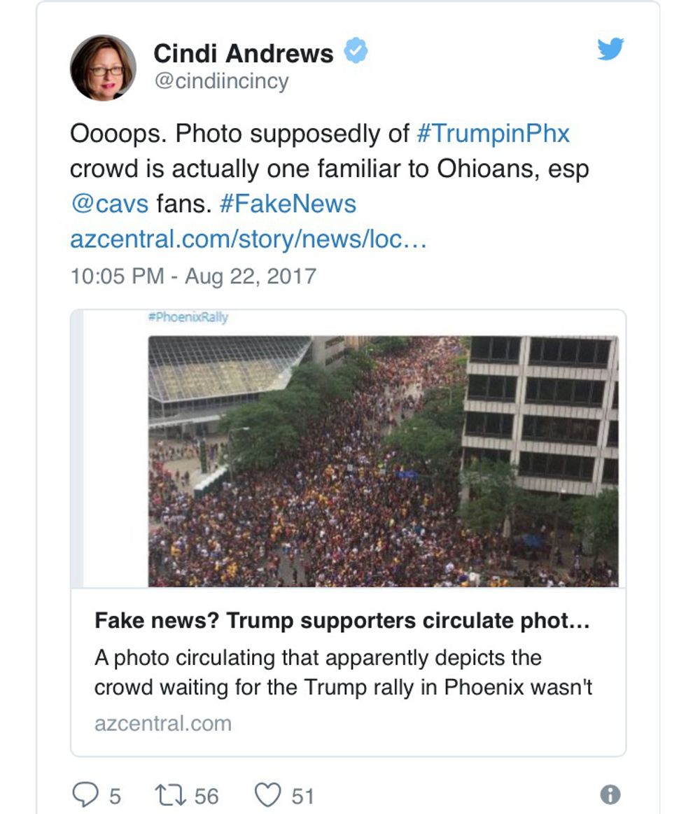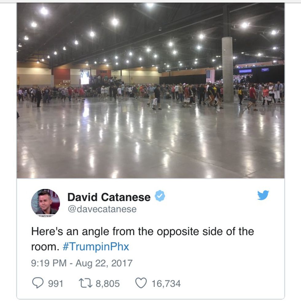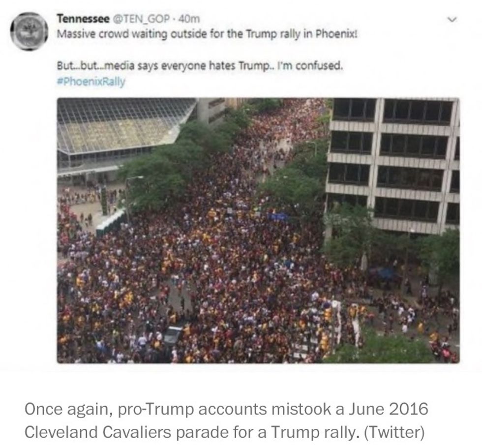 Following Trump's Phoenix rally Tuesday evening, a picture started circulating on Twitter purporting to show massive crowds at the president's campaign-style event. According to HuffPost, one account, @TEN_GOP, a self-described "Unofficial Twitter of Tennessee Republicans" with more than 73,000 followers, grabbed the image and fashioned it into a now-deleted tweet:
