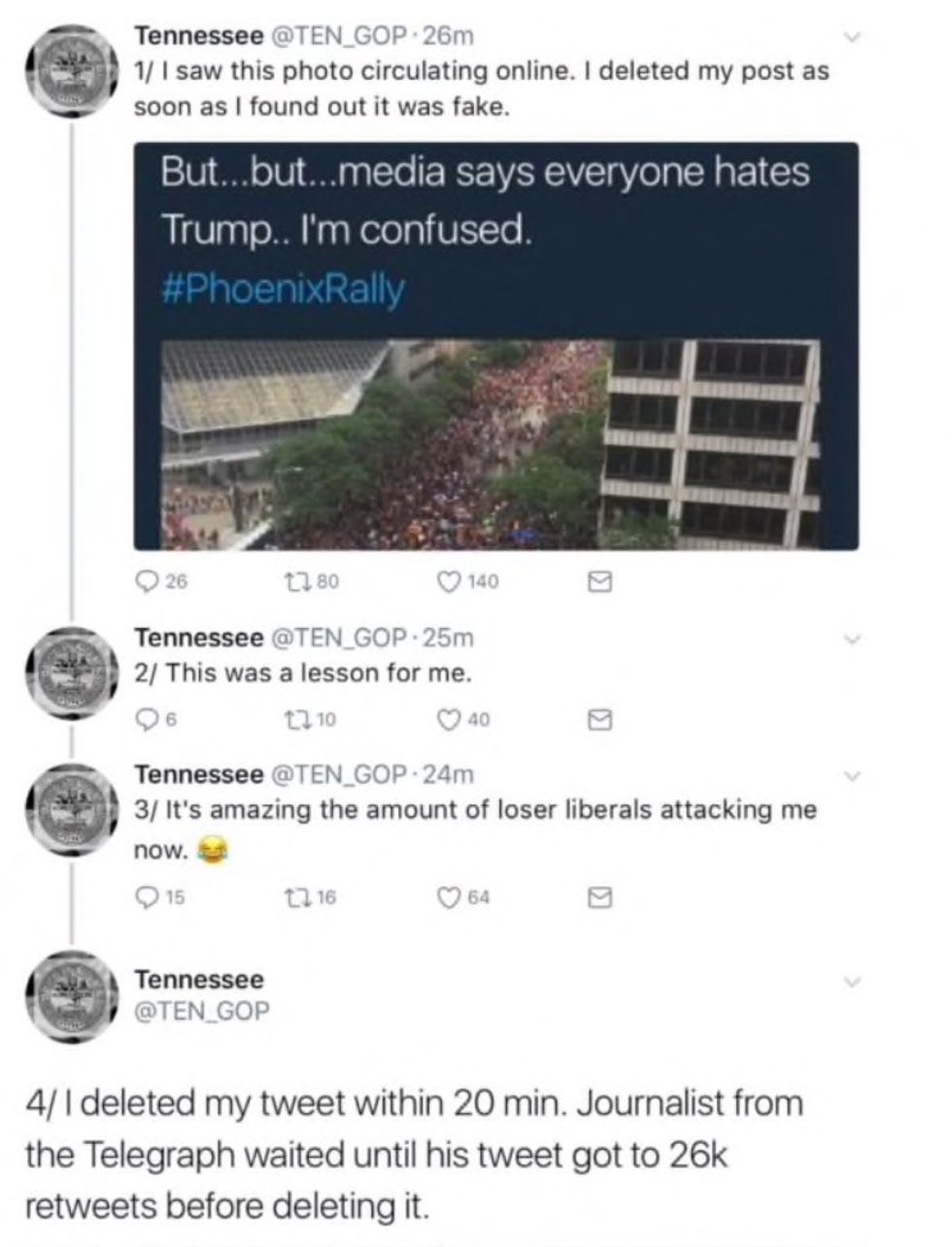 The mistake became evident Tuesday night. Most of the retweets were deleted. @TEN_GOP apologized, and the entire account was deleted by Wednesday.