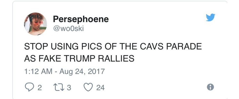 Some of the confusion between Cavs fans and Trump supporters is the work of keyboard-pounding provocateurs. One Twitter user in particular, a Columbus-based social media marketer named Chris McNeil, has purposely shot out parade images to Trump fans and related media outlets, baiting them into the mistake.