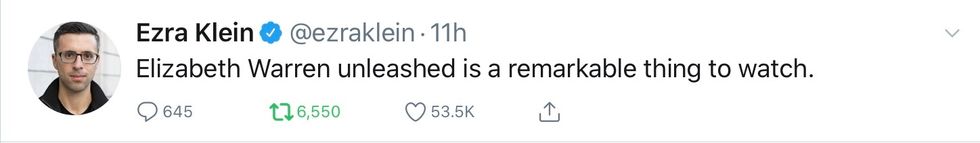 "Look, I'll support whoever the Democratic nominee is but understand this: Democrats take a huge risk if we just substitute one arrogant billionaire for another," she added, drawing painful parallels between Bloomberg and Trump. Warren has been counted out of the race by many — including by a pollster this week who neglected to include her, polling Amy Klobuchar instead as the only viable woman candidate in the race — then made a clarion argument for her candidacy: "This country has worked for the rich for a long time and left everyone else in the dirt," she said. "It is time to have a president who will be on the side of working families and be willing to get out there and fight for them. That is why I am in this race and that is how I will defeat Donald Trump."