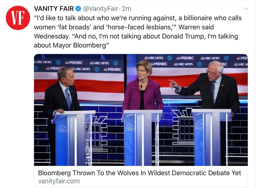 "I'd like to talk about who we are running against, a billionaire who calls women 'fat broads' and 'horse-faced lesbians.'" Warren said. "And, no, I'm not talking about Donald Trump, I'm talking about mayor Bloomberg. We are not going to win if we have a nominee with a history of his tax returns of harassing women and of supporting racist policies like redlining and stop-and-frisk," she said.