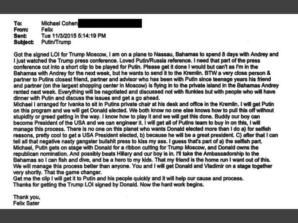 Email to Michael Cohen,Trump lawyer, fr Trump friend & business partner Felix Sater makes clear what Trump Campaign was doing - conspiring with the Russians. Read this carefully. Share. & Don’t watch Trump at SOTU tonight. #TurnOffTrump #TuneInForStacey. Tomorrow #TheEndBegins https://t.co/Hjs5AlK3N7