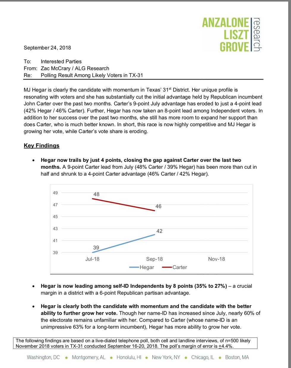 The polls show MJ and her opponent in a statistical tie, his 9-point advantage in July eroded to just a 4-point lead (42% Hegar / 46% Carter). Perhaps even more exciting, she has now taken an 8-point lead among Independent voters.