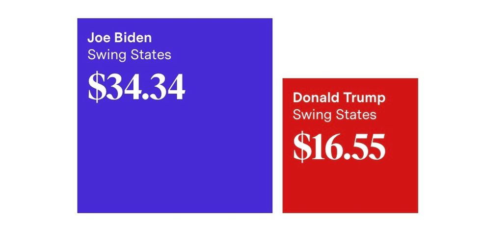 Trump's price advantage in swing states disappeared in September, when the campaigns paid roughly similar prices. In October, Facebook began charging Biden slightly less than Trump.