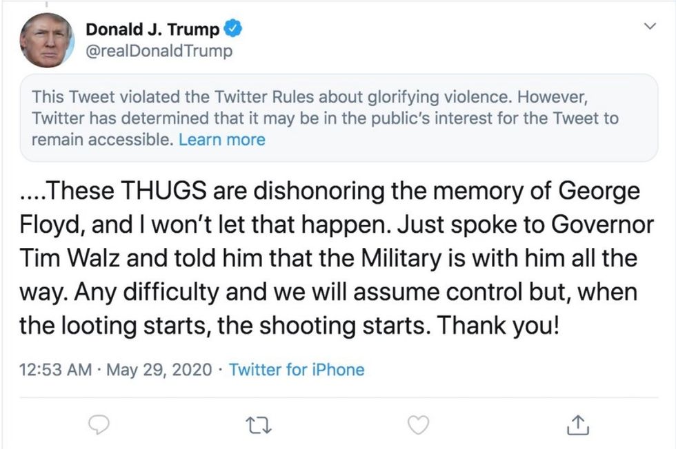 "The hateful rhetoric advocating violence against black demonstrators by the US President does not warrant defense under the guise of freedom of expression," one Facebook employee wrote in an internal message board, according to a copy of the text viewed by The New York Times.