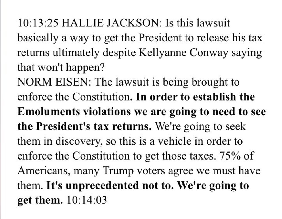 Fmr. WH ethics czar Norm Eisen confirms to MSNBC his Emoluments lawsuit will seek Trump's tax returns in discovery. https://t.co/78BCBSuuxQ