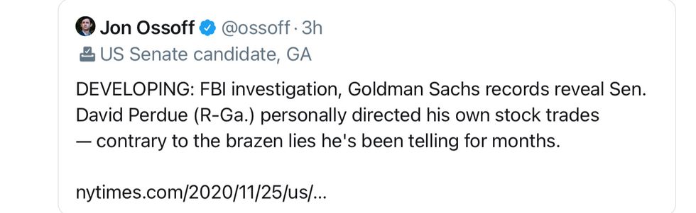 Voices4America Post Script. This story about Georgia Senator David Perdue - he who pretended he couldn't pronounce Kamala's name and he who won't debate Jon Ossoff-gives another reason to get rid of him. There were also his insider trades when he benefitted from Covid briefing. #PerdueIsACrook