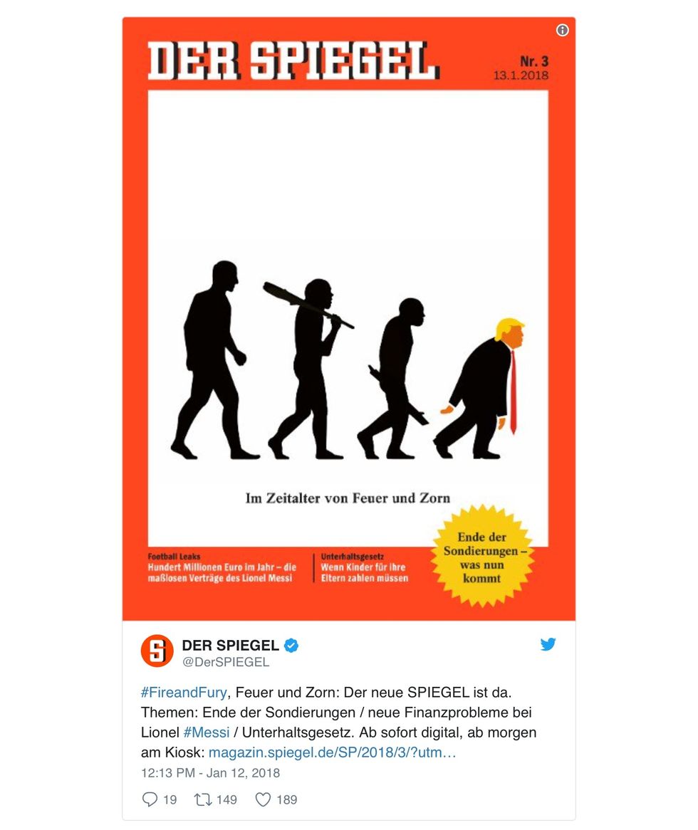 The German magazine Der Spiegel mocked President Trump on its latest cover this week, depicting the president as an devolved man.