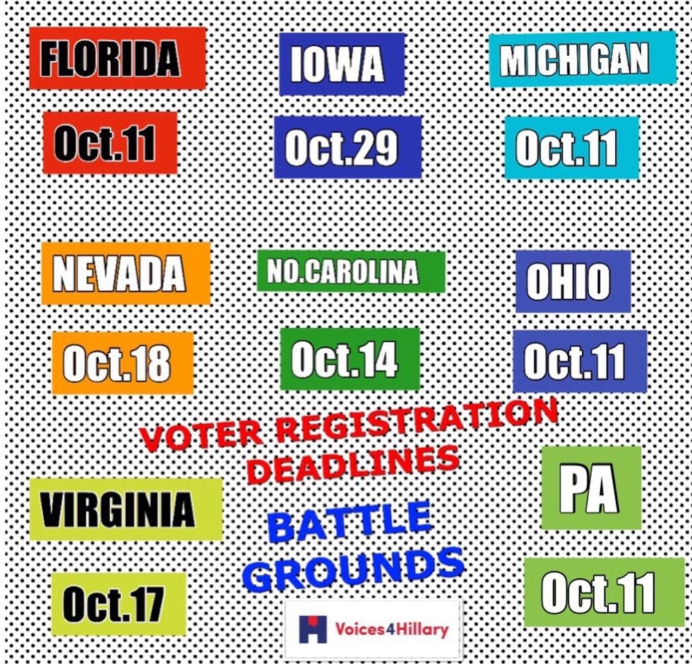 Here are the Battleground State Registration dates again. Two more things too - In Iowa, thanks to early voting, people can register to vote and vote at the same time, if they choose. North Carolina ONE STOP EARLY VOTING starts on October 20 and ends on November 7.