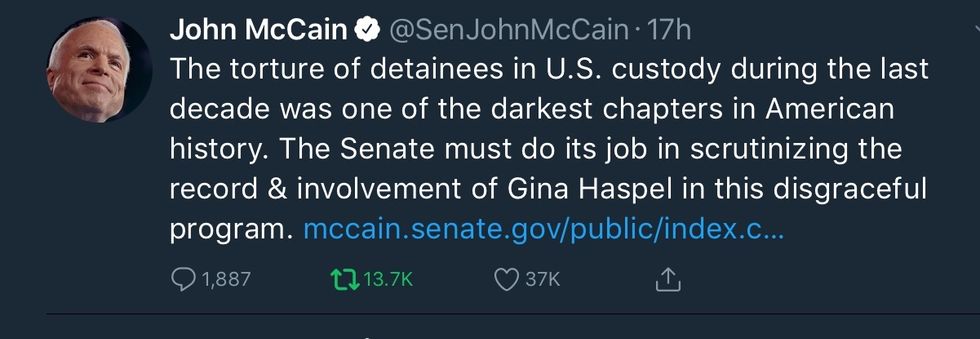 Sen. John McCain (R-Ariz.), who was tortured while imprisoned in Vietnam, said Haspel's Senate confirmation should be conditioned on securing a pledge to block any plan to reintroduce harsh interrogations. "Ms. Haspel needs to explain the nature and extent of her involvement in the CIA's interrogation program," McCain said.*