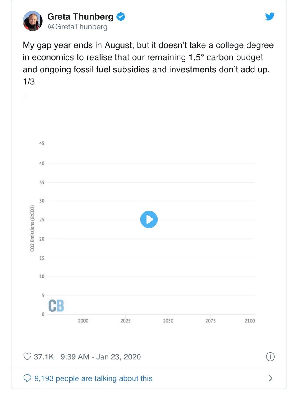 "My gap year ends in August, but it doesn't take a college degree in economics to realize that our remaining 1,5° carbon budget and ongoing fossil fuel subsidies and investments don't add up," Thunberg tweeted in response.