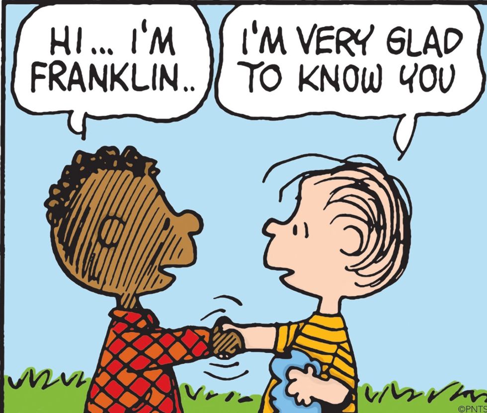 Is this your beach ball?" These were the first words spoken by Franklin, addressing Charlie Brown as the latter stared glumly out to sea. And this is how Charles M. Schulz integrated his comic strip, "Peanuts," on July 31, 1968. Franklin's initial three-strip arc unfolded quietly and gently, with the boys building a sand castle together while chatting.