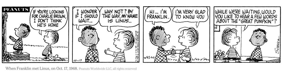 Fifty years after Franklin recovered Charlie Brown's beach ball, we're still living through times when representational firsts are newsworthy and cherished by fans: the first kiss between Asian and black characters in a "Star Wars" film (Rose and Finn in "The Last Jedi"), the first Marvel Studios movie headlined by a black superhero (next month's "Black Panther"). Franklin might not have been the most fascinating fellow ever to populate the comics universe, but as his story shows, a first like him is necessary to advance the march of representation.