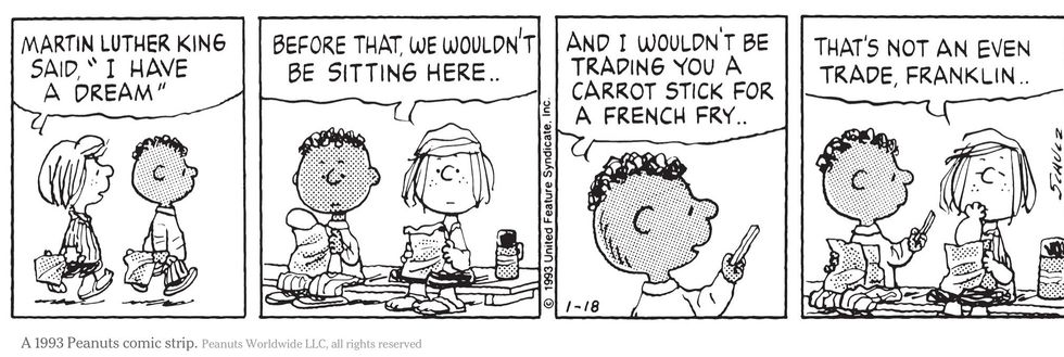 Dr. King's assassination, on April 4, 1968, played a direct role in Franklin's creation. Eleven days later, a Southern Californian named Harriet Glickman wrote to Mr. Schulz, introducing herself as "the mother of three children and a deeply concerned and active citizen." In her grief, Ms. Glickman explained, she had been pondering "the areas of the mass media which are of tremendous importance in shaping the unconscious attitudes of our kids." She then proposed an idea: "the introduction of Negro children into the group of Schulz characters."