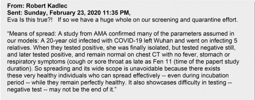 "Is this true?!" Dr. Kadlec wrote back to the researcher. "If so we have a huge whole on our screening and quarantine effort," including a typo where he meant hole. Her response was blunt: "People are carrying the virus everywhere."