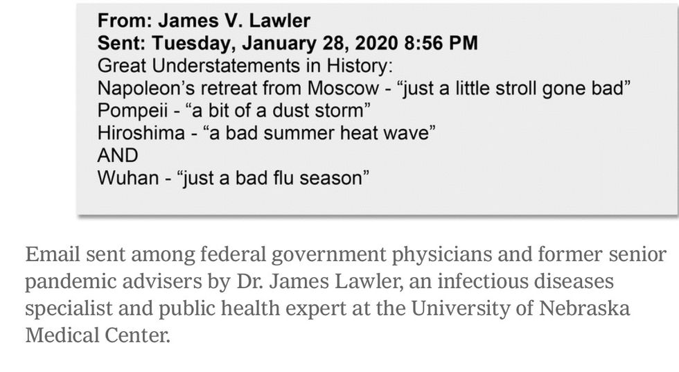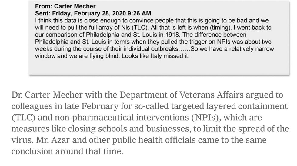 A week after the first coronavirus case had been identified in the United States, and six long weeks before President Trump finally took aggressive action to confront the danger the nation was facing — a pandemic that is now forecast to take tens of thousands of American lives — Dr. Mecher was urging the upper ranks of the nation's public health bureaucracy to wake up and prepare for the possibility of far more drastic action.
