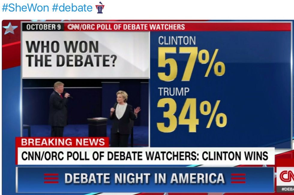 According to a CNN/ORC poll of debate watchers and a panel of analysts from the Los Angeles Times, Hillary resoundingly won the debate last night. The CNN results showed a clear victory for Hillary with 57 percent saying she won, versus 34 percent for Trump.