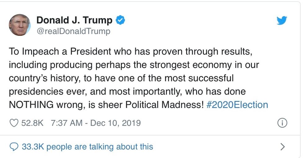 A little more than an hour before Democrats' announcement, Mr. Trump declared on Twitter that it was "sheer Political Madness" to impeach a president who has done "NOTHING wrong" and overseen "perhaps the strongest economy in our country's history."