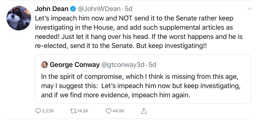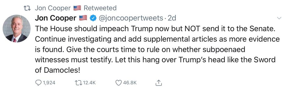 But we want him removed. After he is impeached in the House, should the Dems delay acting in the Senate, to gather more and more evidence? It would sure stop the circus he is planning in the GOP controlled Senate. #ArticlesOfImpeachment #ImpeachRemove