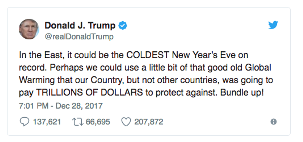 First and most obviously, scientists stress that nothing about winter cold — even the extremes now assaulting the East Coast in a historic "bomb cyclone" — refutes global warming. They've been making the point even more loudly in the wake of this tweet: