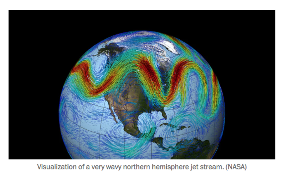There are a lot of ideas, one of which involves changes to the high-altitude jet stream, which plays a powerful role in driving northern hemisphere weather, and which Rutgers University scientist Jennifer Francis suggests has been getting more wavy and elongated of late, intensifying both ridges and troughs and leading extreme weather to get stuck in place for longer.