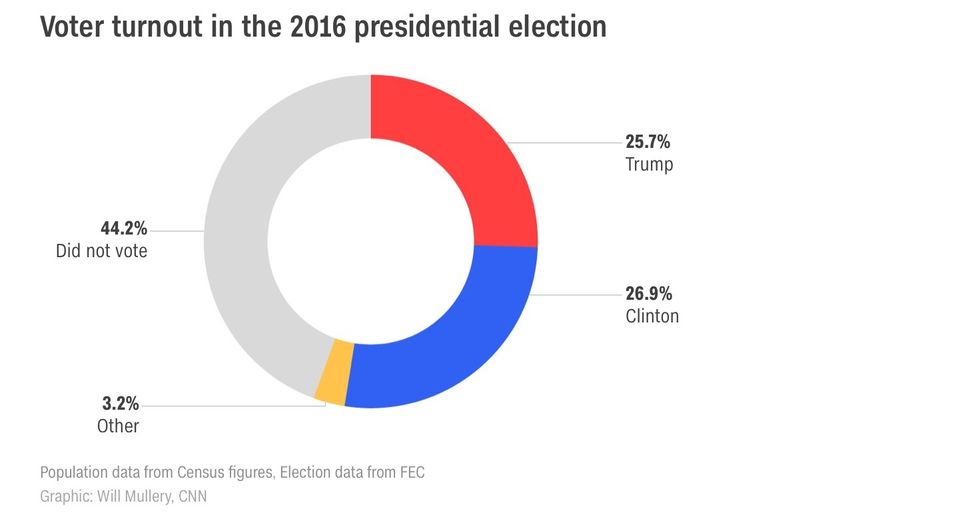 This is an imperfect way of viewing things, obviously. That 244.8 million Americans includes nearly 21 million voting-age non-citizens living in the US.That only a little more than a quarter of adults voted for either Trump or Clinton in the election is an extreme reminder that about half of the population over the age of 18 either wasn't interested enough in the election or was too disgusted by both candidates.That's not exactly a new phenomenon. A smaller portion of the population voted in 2016 than in any election since 2000 and only 53.5% of Americans voted in 1996.Turnout in midterm elections is usually even much lower. In 2014, 33.2% of the voting age population voted, according to electproject.org. In 2010, an election in which Republicans took the House from Democrats, it was 37.8% and the last time Democrats took the House from Republicans, in 2006, it was 37.2%.It's long been a relatively small portion of the population that decides who controls the government.