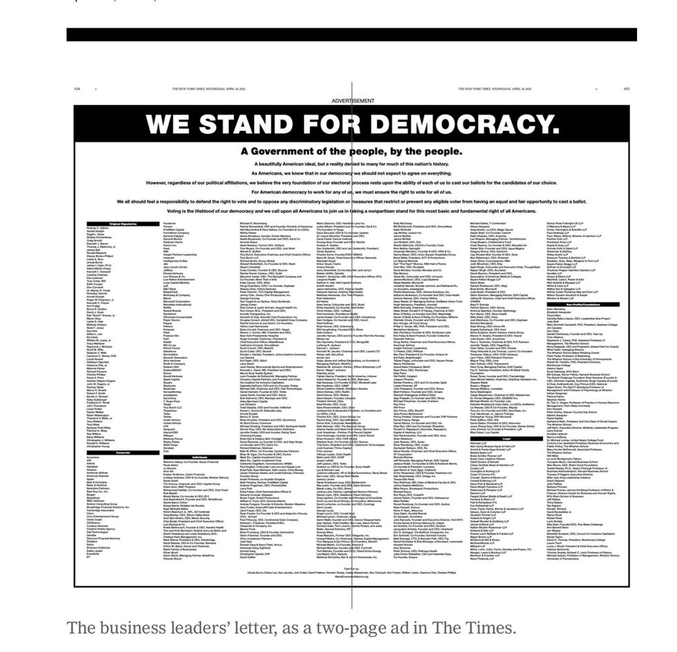 Amazon, BlackRock, Google, Warren Buffett and hundreds of other companies and executives have signed a new statement opposing "any discriminatory legislation" that would make it harder for people to vote. The statement, which ran as a two-page ad in The Times, comes amid a flurry of voting-related proposals from Republicans that have generated competing calls for corporations to take a stand and to stay out of politics lest lawmakers retaliate, David Gelles and Andrew write in The Times. And just as notable as the names who signed the statement are those that didn't.