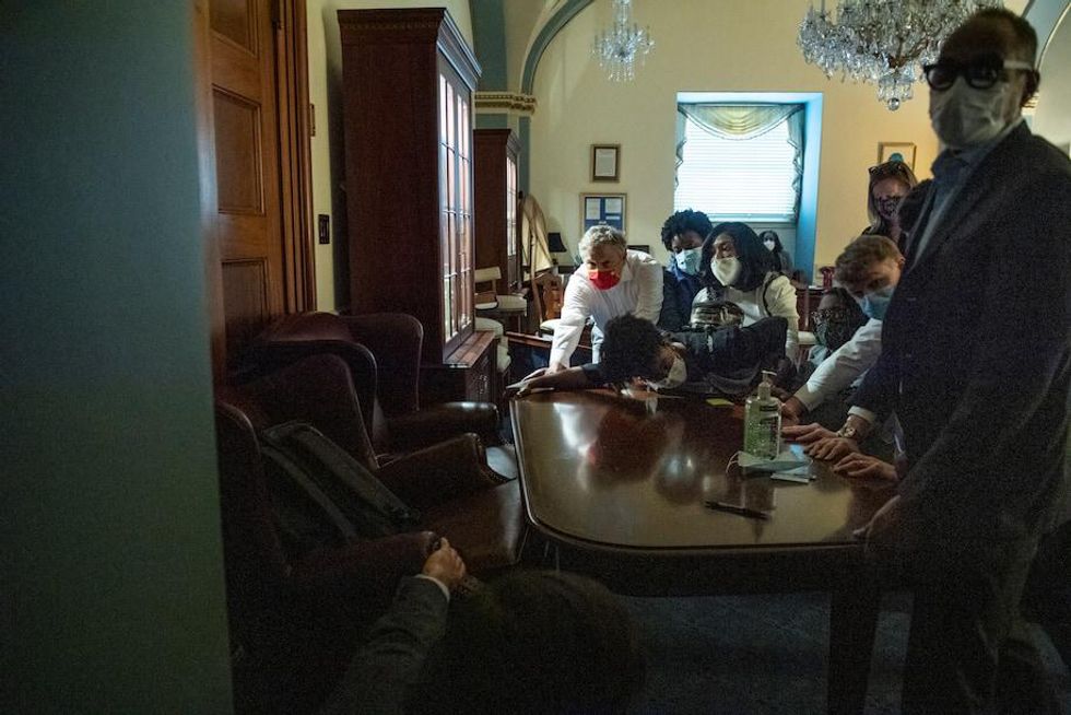 Eight Pelosi staffers trapped inside their suite barricaded themselves inside a staff conference room, and huddled together under the table in the middle, hoping that the protesters who had already broken down one door — and were rummaging through materials and shooting selfies with their feet up on an executive assistant's desk — wouldn't make it any farther inside.