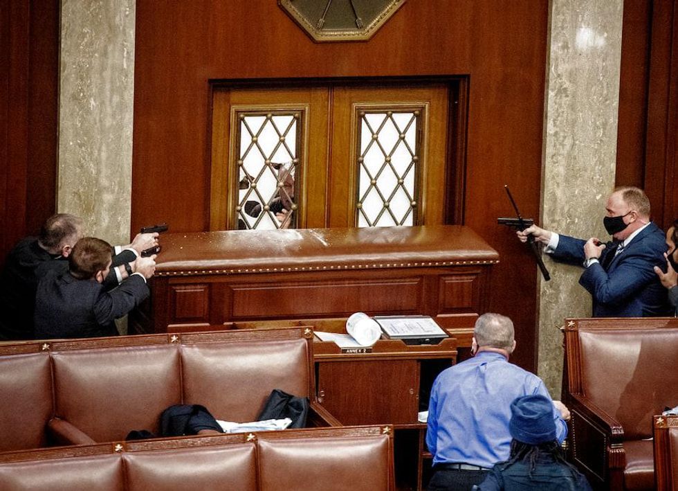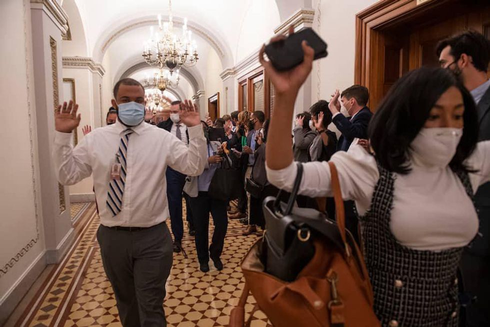 Inside the chamber, news photographers that Pelosi (D-Calif.) had allowed in to capture the historic electoral vote at the dais instead turned around and trained their cameras toward the doors in the back of the chamber.