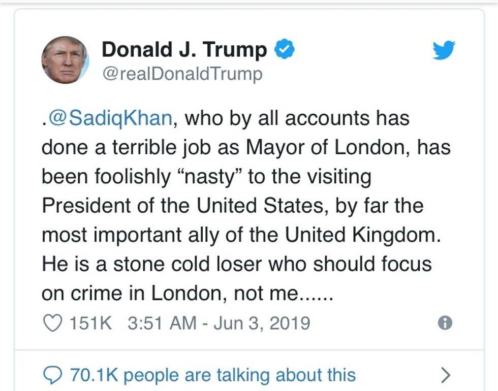 You may know by now that thin skinned Trump arrived in London on a wave of tweets attacking Sadiq Khan. Here is a sample.