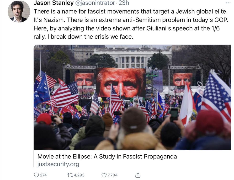 Jason Stanley (@jasonintrator) is the Jacob Urowsky Professor of Philosophy at Yale University. Before coming to Yale in 2013, he was Distinguished Professor in the Department of Philosophy at Rutgers University. Stanley is the author of Know How; Languages in Context, and Knowledge and Practical Interests, which won the 2007 American Philosophical Association book prize. More recently, he is the author of How Propaganda Works (2015), which won the PROSE Award for Philosophy from the Association of American Publishers, and How Fascism Works: The Politics of Us and Them (2018) He has written about authoritarianism, propaganda, free speech, mass incarceration, and other topics for The New York Times, The Washington Post, The Guardian, Newsweek, The New Republic, Project Syndicate, and many other publications.