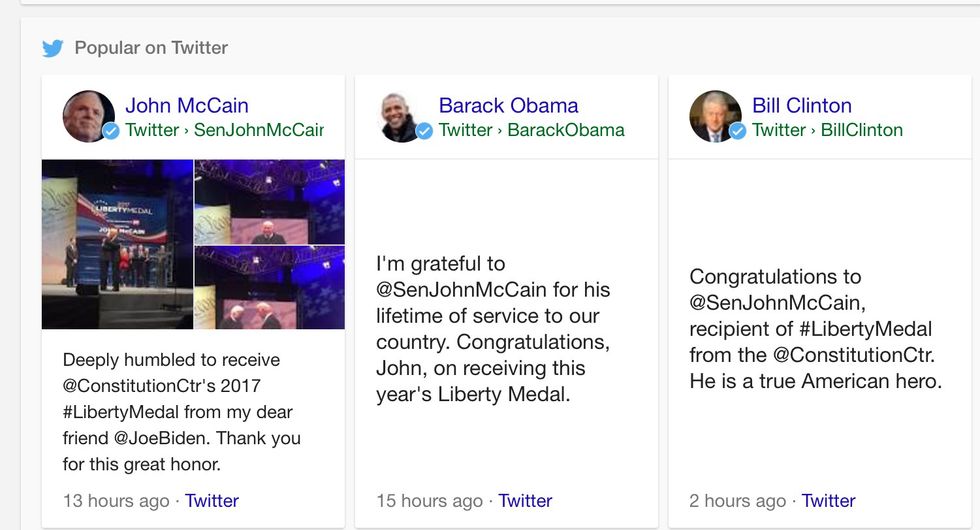Sen. John McCain (R-AZ) was awarded the 2017 Liberty Medal at the National Constitution Center in Philadelphia, Pennsylvania on Monday evening. After receiving the honor, which was presented to him by former Vice President Joe Biden, the highly respected war hero went on to give a speech that did not hold back. Although McCain never outright says the name "Donald Trump" in the speech, it's pretty clear who he's referring to when he calls out "half-baked, spurious nationalism" from "people who would rather find scapegoats than solve problems."